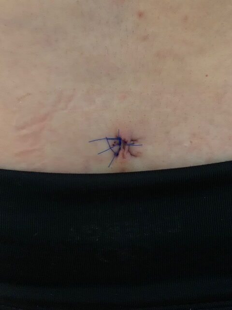 The small incision in Candace Andries’ lower back required only three stitches: “The fact that they could fix my disc through such a small opening blows my mind,” she says.