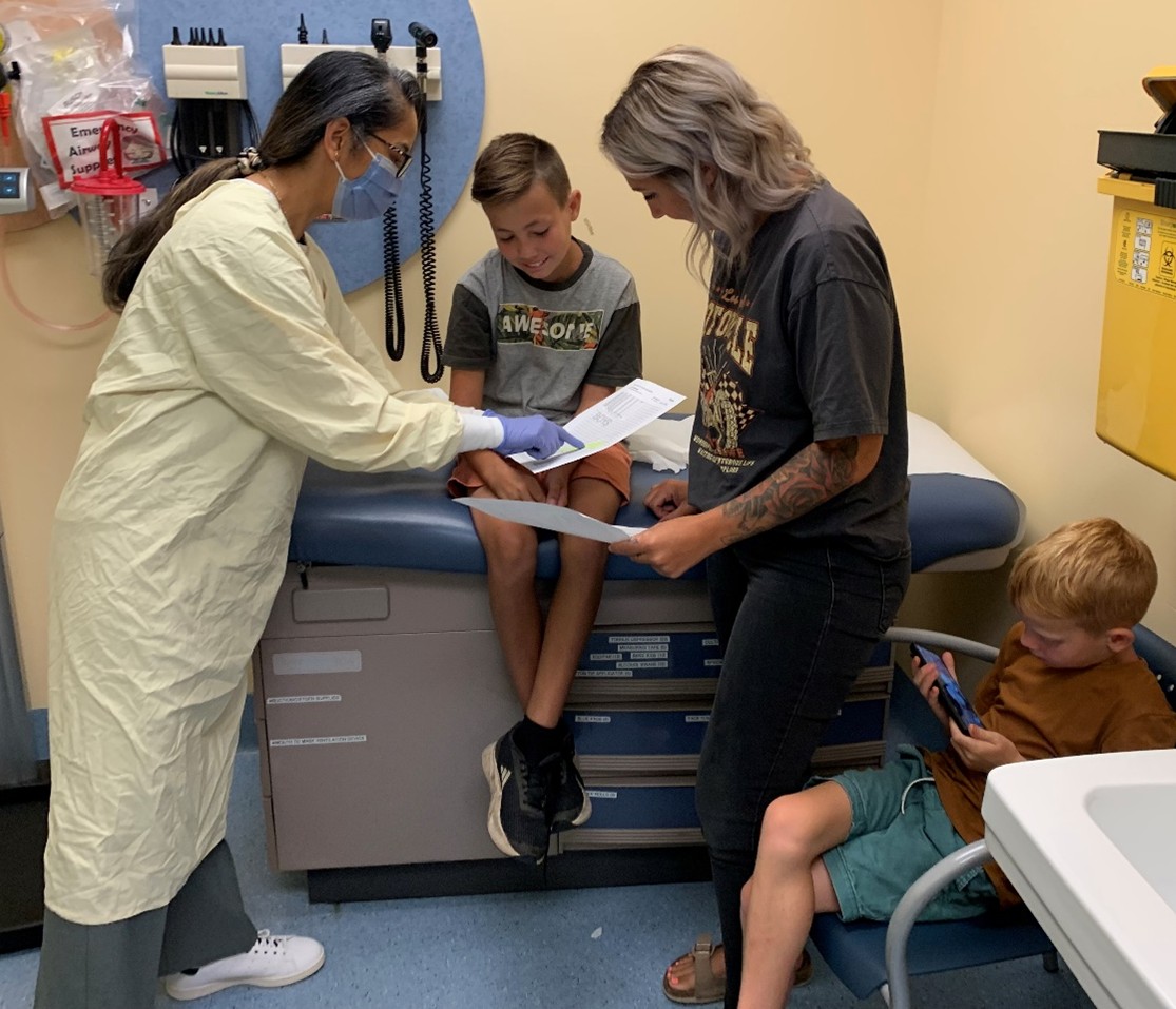Rhiza Regalado Lam Chew Tun, clinical dietitian at HSC, shares test results with a pediatric patient and his family in HSC’s Pediatric Cystic Fibrosis Clinic.