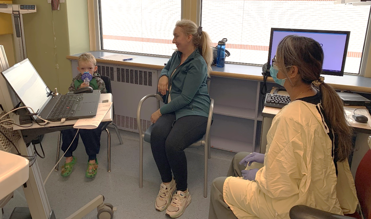 Rhiza Regalado Lam Chew Tun, clinical dietitian at HSC, observing a lung function testing of a young patient in HSC’s Pediatric Cystic Fibrosis Clinic.