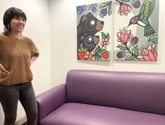 Winnipeg-based mural artist Justine Proulx stands next to her painting that was recently installed in HSC’s Sexual Assault/Intimate Partner Violence Program space.