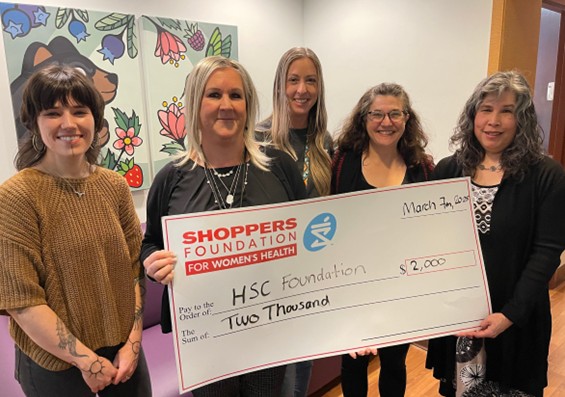 (L to R): Justine Proulx, Winnipeg mural artist; Trisha Knight, Director of the SAIPV program; Drea Pollard, Nurse Educator with HSC’s SA/IPV program; Glynis Corkal, Development Officer with the HSC Foundation; and Kimi Guilbert, Shoppers Drug Mart Store Associate and generous donor.