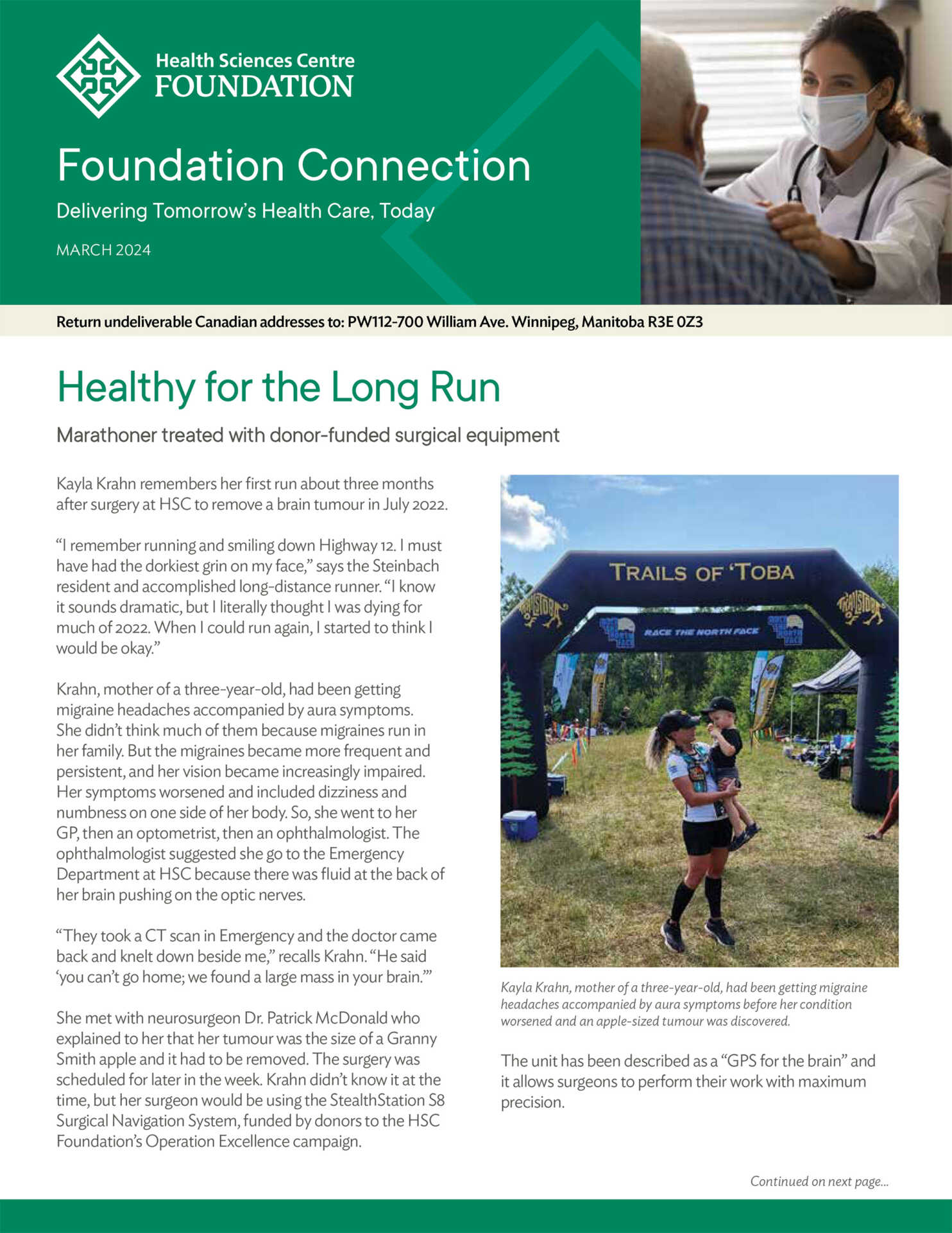 In our Winter 2024 newsletter you will read about how, thanks to the care and skill of surgeons at HSC, along with her own tenacity, Kayla Krahn went from having a brain tumour the size of a granny smith apple removed to returning to long-endurance running; you will meet wildlife photographer Brock Gunter-Smith who, after receiving complex spine surgery from Dr. Michael Johnson, is back to finding peace in nature; you will learn about Technology for Assisted Living, the program’s new Chair, and what this means for our community; and more!